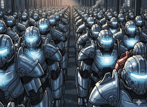 Inside, behind several crates of the unlisted CrimePrev branded Meta-restraints, two independent inspectors in white coats and hardhats were arguing with a couple of Dalton’s staff in safety vests about the large metallic humanoid they’d found at the rear of the stockpile of Brute Suits. It was easily nine feet tall, barrel-chested with a small single-eyed ‘head’ and a powerful blaster replacing the right arm. It was clear from its shape and design parameters that this was not designed to house anyone inside it and was apparently a fully autonomous robot, a battle droid possibly? It was also clear that it was powering up if the increased glow in its single red ‘eye’ was anything to go by – whether it was a result of the people around them switching something on or it was acting independently, it was impossible to say.