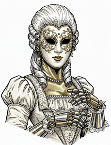As she spoke, she ripped off her silk dress and removed her mask to reveal a bronze-coloured robotic body and a mechanical head that had flared panels on either side of the cranium that the mask had disguised. There was something ancient, almost Egyptian, about the design. As her entourage, bar the masked figure with three faces, similarly disrobed, she continued, “This, I the Clockwork Queen promise.”