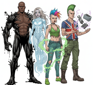 Mace readied a Dazzle bolt and fired it so that it embedded in the wall above the doorway revealing a black, bald-headed man whose body was inhumanly spread across the entrance blocking anyone or anything from getting through. “Come and get some ya muckas!” he shouted in an almost Geordie accent even as a semi-transparent female with short, white hair seemed to be dissipating sections of his elongated tar-like body. Standing nearby in a cloud of acidic mist was a tattooed and ring-festooned female in a multi-coloured Mohawk and nearby watching were three identical stationary figures. Each wore a red hooded cloak but it barely concealed a metallic armoured body that was either robotic in origin or was wrapped around extremely anorexic wearers. They appeared to be simply observing for the moment. The tattooed female was Solvent and the nervously giggling, fizzing insubstantial female had to be Fizzgig; they, with the tar-like figure blocking their progress who they were sure was Blackstuff, were the remaining members of the Untouchables. Repulse (who Mace was sure was Solvent’s boyfriend) seemed in shock at the sight in front of them.