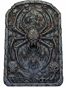 In front of her, the frozen lock shattered and the girl rushed into the cell and immediately grabbed one of the stone carvings, a large stone tablet decorated with a horrific looking spider pattern.