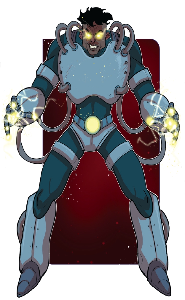 Large heavily insulated cables then ran from this mechanical monstrosity to a semi-comatose young black youth in the main chamber, almost totally enclosed in a bulky amplification suit. This had to be NegaWatt and he appeared to be hyped-up on drugs – some sort of power enhancers possibly?