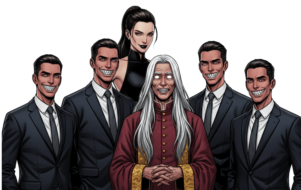 There was a family resemblance in that they all had similar facial looks; grey eyes, an unusual reddish tinge to their skin as well as a mouthful of sharp, shark-like teeth. They had to be followers of the cult known as the Eightfold Way – Banshee had encountered them after an assault on the Museum and a subsequent siege at the Carpathian Embassy a few months before.