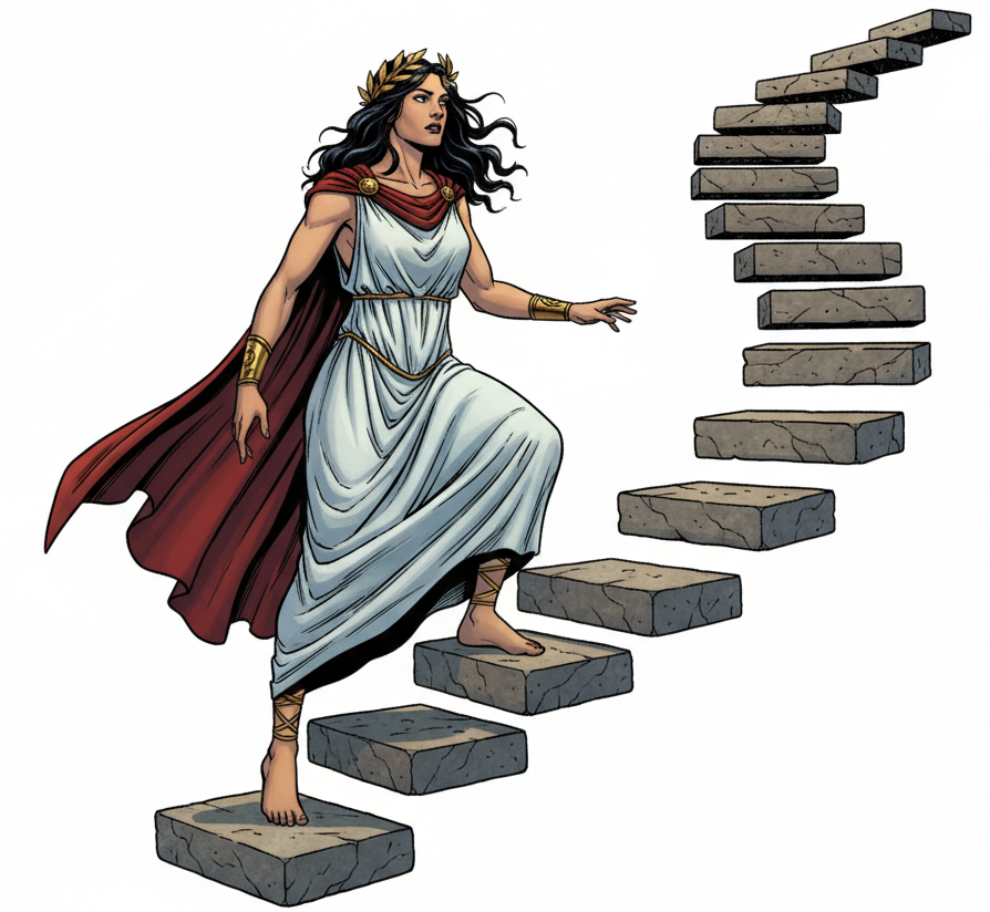Akira touched the doors and transformed them into transparent glass. Through this, they could see a windswept field, near a short, archaic stone platform, ten metres high and twenty metres across – an ancient observatory. A winding stairway around its perimeter led to the top, where stone columns ringed the outer edge. A black-haired woman in Greek dress danced above the ground, the stones of the tower pulling free of the walls and rising up automatically to meet her feet. Paragon muttered, “I bet that’s Medea.” The others nodded in agreement. “Isn’t she an Atlan?” The others didn’t comment.