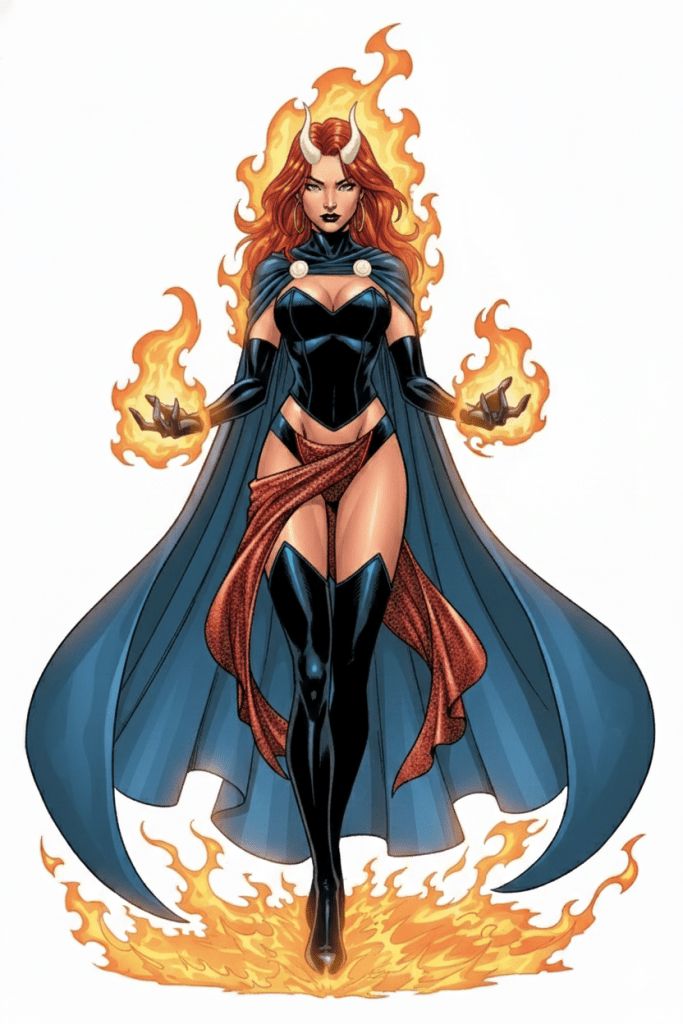 The heat hit them like a wall as they reached a broad ledge of black stone overlooking a boiling pit of molten rock. The air above it shimmered with the intense heat. Rising tendrils of volcanic gases and narrow branches of solidified rock stretched across the pool. Sheer black-glass walls rose around the crater on all sides, save for several ledges that had been seemingly carved into the glossy surface. Fathom, Sylph and a still recovering Pyre of the Factor Four stood around the opposite edge from them. Standing between them was a tall woman with long, flaming red hair, with two horns on her forehead. She was dressed in a black corset and thigh-high boots, with a flowing black cape and surrounded by flames;