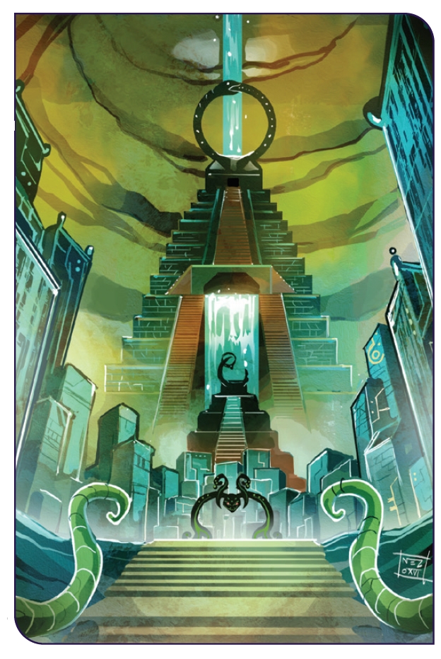 They stepped forward and instantly found themselves looking at something quite different: They now stood in the interior of a vast cavern, filled with a strange and ancient city of jade towers and serpentine archways, covered in alien symbols and inhuman carvings. A grand, palatial structure loomed above the city itself. There was something reptilian about the city, though they would struggle to say why, exactly. Akira did remember seeing something about Agartha having apparently been built by the ancient Serpent People, survivors of sunken Lemuria but they had abandoned it for some reason.