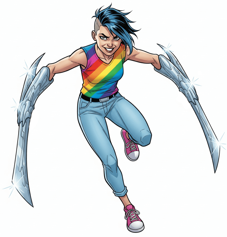Arsenal had recovered enough to get back onto her feet and was trying to stab X-Ray again. Her blade sliced at his costume before it her right arm/blade began to change shape, into something resembling a cannon. Seemed blades weren’t the only weapon the blue haired girl seemed to be able to manifest.