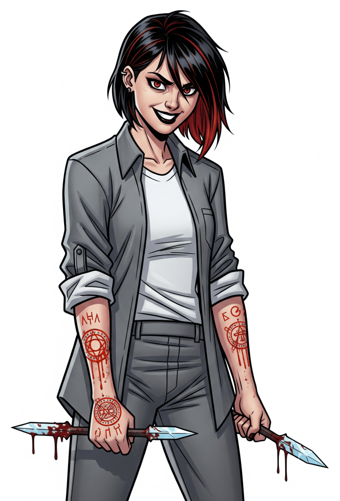The blue haired female ‘Arzenál’, was also present, her arms already transformed into sharp blades that glistened in the artificial twilight. They could now see the others – the lightning-casting Electrocutioner and the psychotic woman known as ‘Krvavá Marie’ or Bloody Mary, her eyes devoid of emotion even as her lips were twisted into an evil grin.