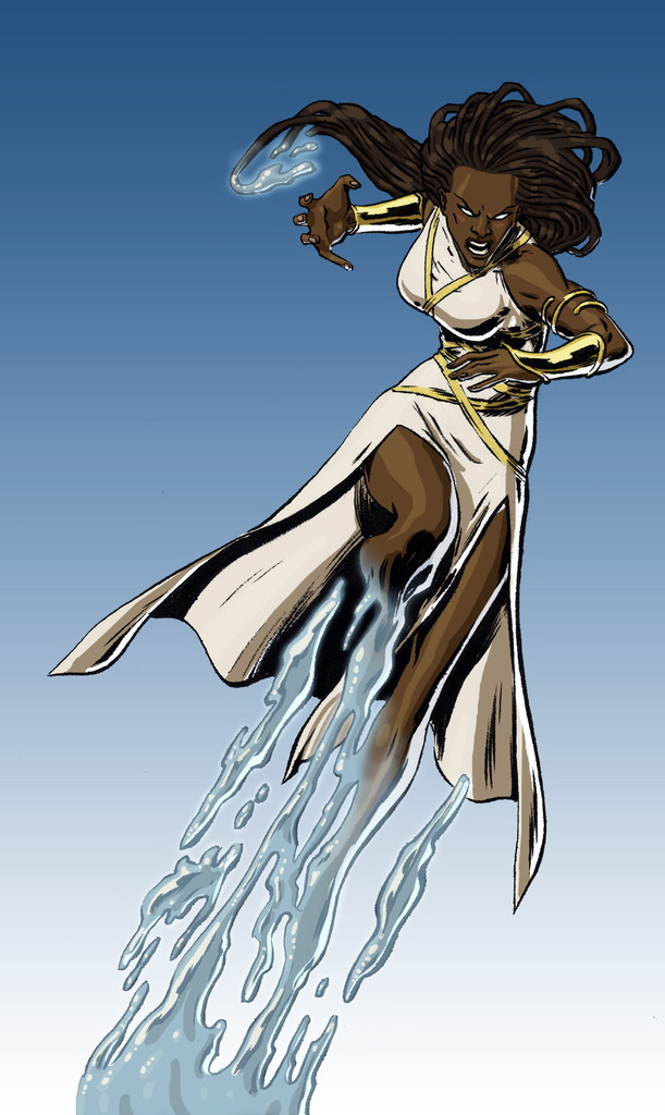 Half-an-hour saw The Balance leaving The Crate on auto-pilot hover mode and exiting the craft. Even three-hundred metres away from the rig they were being buffeted by strong winds, and X-Ray’s extraordinary vision revealed the cause of the maelstrom; in the eye of the storm, right above the deck of the oil rig, was a flying black woman, obviously in control of the weather phenomena. With a wave of her arms lightning bolts erupted from the blackened skies and clove through the clouds, splitting the darkness with bright neon light, striking the deck with thunderous power. Dodging the bolts were several people; six males wearing identical black hi-tech ninja uniforms with three red… what? Lenses?… on their headsets, and carrying blaster rifles, and a single attractive woman wearing an expensive-looking dress. Thankfully for X-Ray, there were no feelings revealing the presence of Anti-Life; whoever these people were, they weren’t vampires.