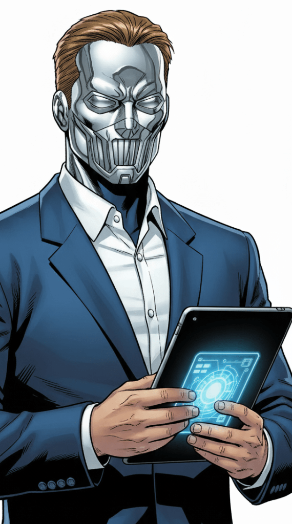 he Professor. There he stood, the same image of the man they had met in Switzerland several months before. Smart blue suit and white shirt, face masked by a metallic façade; human-looking, but the features were sharply angled, mechanical…and a microphone mesh completed the wrongness. He seemed to be waiting…