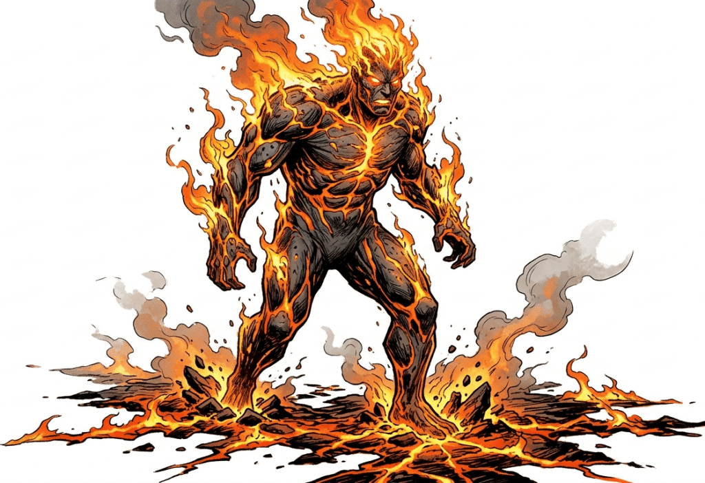 The effect was that Magma’s flames were starved, and he reverted to his human form, naked except for the covering of ice, before trying to push his way up the stairs only to find that to ensure privacy the staff had locked the door at the top.